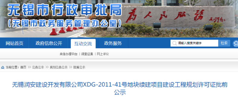 近日,无锡市行政审批局官网公示了无锡润安建设开发有限公司XDG-2011-41号地块续建项目建设工程规划许可证批前公示。 XDG-2011-41号地块续建项目即去年成功通过阿