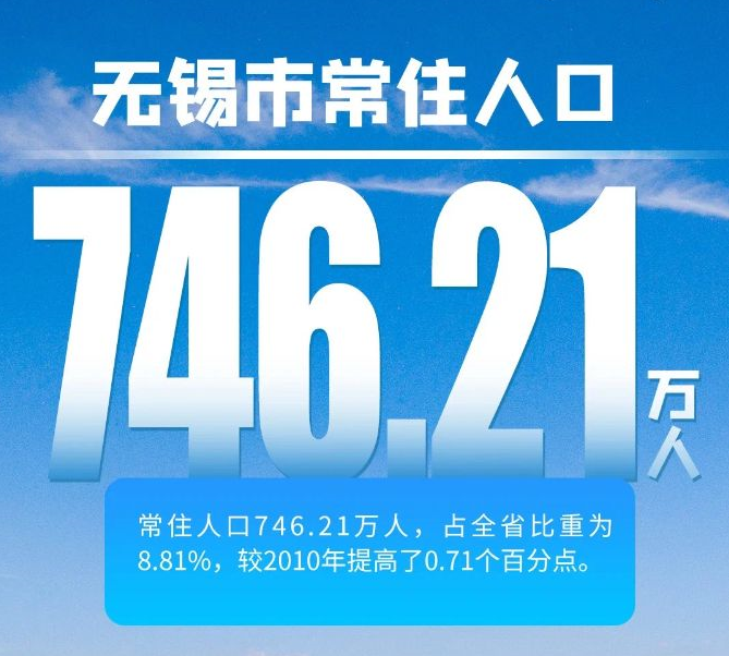 从江苏省第七次全国人口普查新闻发布会及江苏省统计局网站获悉,第七次全国人口普查结果显示,2020年11月1日普查时点,无锡市常住人口746.21万人,占全省比重为8.81%,较2010年提高了0.