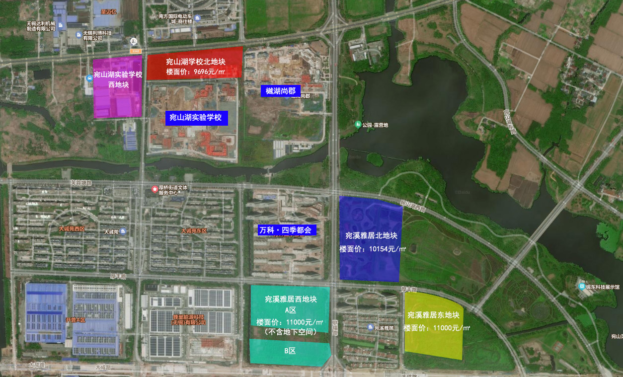 2024年11月,宛山湖实验学校北地块(XDG-2024-52号地块)成交,楼面价9696元/㎡,由无锡宛湖投资发展有限公司竞得。
