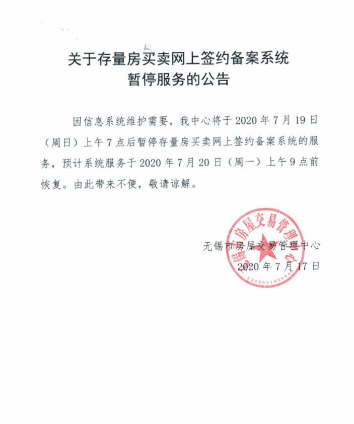 市场网首页 > 新闻中心 > 独家 > 正文 关于存量房买卖网上签约备案系统暂停服务的公告 2020-07-17 15:11:32 无锡房地产市场网 本文为无锡房地产市场网原创,谢绝各类形式的转载、刊登。未经许可,私自转载者,本站将追究其相关法律责任。 (责任编辑:李飞飞)