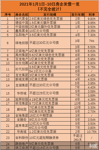 规模较小房企在本轮融资中成本则较高。1月6日,当代置业公告发布2.5亿美元债,票面利率达到9.8%,同一日中梁控股发布2亿美元债,利率9.5%,1月7日早间,华南城发布1.2亿美元债,利率达到10.75%。