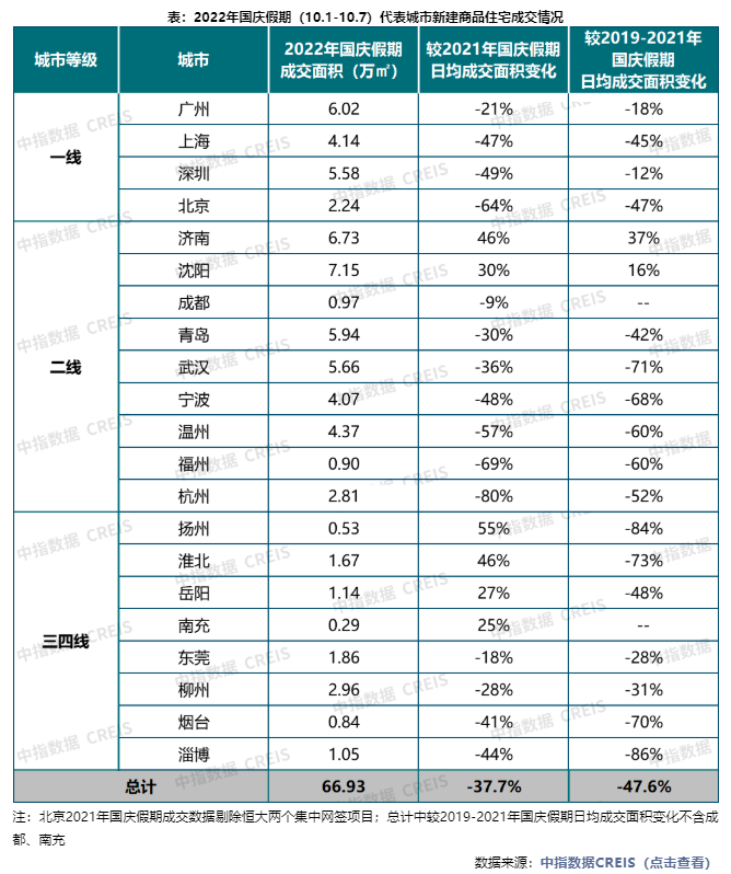据中指院10月8日公布的数据,今年国庆假期期间(10月1日-7日)全国20个重点监测城市新建商品住宅成交面积66.93万平方米,较去年国庆假期日均成交面积下降37.7%。