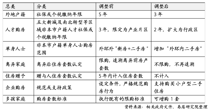 具体来说,此次通知在住房限购政策上进行松绑:包括非本市户籍购房社保年限由5年调整为3年;非本市户籍单身人士可购买外环内二手房;人才购房由3年改为2年,范围由产业片区扩大为行政区;取消离婚三年合并计算限购套数的政策;取消赠与5年内计入赠与人住房套数的政策;支持企业购买小户型二手房;多子女家庭可额外增加一套购买名额。