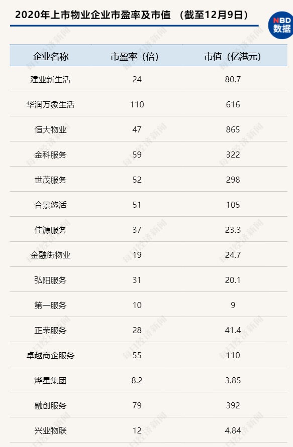 仅从近期上市的物业新股情况来看,截至12月9日收盘,华润万象生活获得110倍市盈率,位列物业股估值第一名,刷新了11月19日融创服务上市首日获得的85倍估值纪录,截至当日收盘,华润万象生活市值约616亿港元。金科服务获得60倍市盈率,市值约326亿港元,而在11月17日上市当日市盈率则为52.69倍,总市值约291亿港元。
