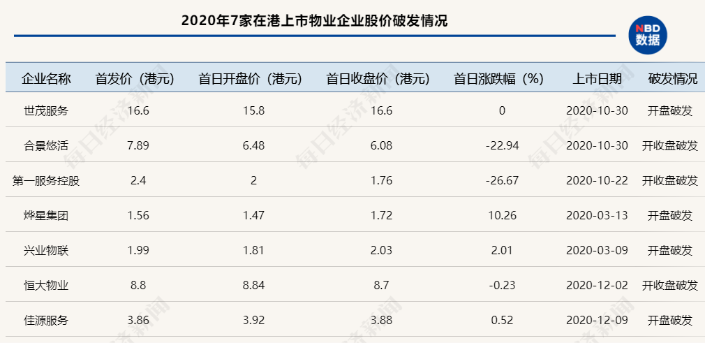 与世茂服务同日上市的另一物业企业合景悠活也未能逃脱破发的命运。合景悠活上市首发以6.48港元/股开盘,较每股7.89港元/股的发行价大幅低开。开盘后5分钟,最高跌幅逾20%,尽管有承销商农银国际大举出手护盘,股价有所回升,但收盘最终仍录得接近23%的跌幅。