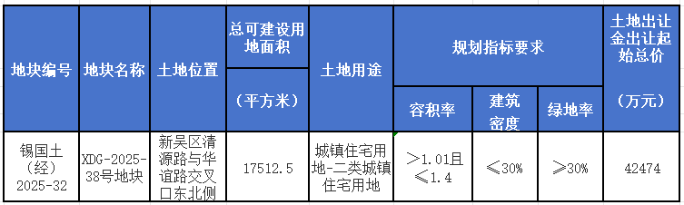 属于太科园核心板块,位于新吴区清源路与华谊路交叉口东北侧,占地面积17512.5㎡,规划为二类城镇住宅用地,容积率>1.01且≤1.4,土地出让起始总价42474万元,折合楼面单价17324元/㎡。