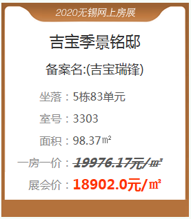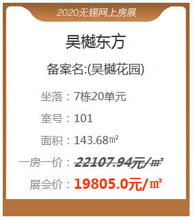 新吴区吴樾东方带来了5套特惠房源,面积约98-163㎡。特惠房源一房一价约16860-22108元/㎡,本次房展会提供的优惠房源中,单套总价最高优惠约33.09万,你难道不心动?快行动起来吧!