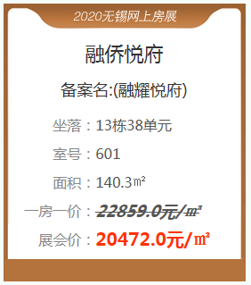 梁溪区融侨悦府提供了2套特惠房源,面积均为140㎡。特惠房源一房一价约22559-22859元/㎡,本次房展会提供的优惠房源中,单套总价优惠均超33万,优惠力度相当之大,如此机会对置业者来说绝对是不可多得。