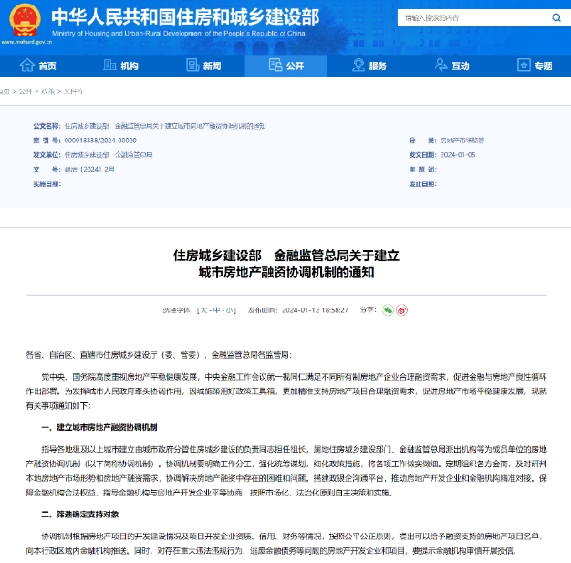1月12日晚间,住房和城乡建设部、金融监管总局联合发布《关于建立城市房地产融资协调机制的通知》(以下简称《通知》),指导各地级及以上城市建立由城市政府分管住房城乡建设的负责同志担任组长,属地住房城乡建设部门、金融监管总局派出机构等为成员单位的房地产融资协调机制(以下简称协调机制)。