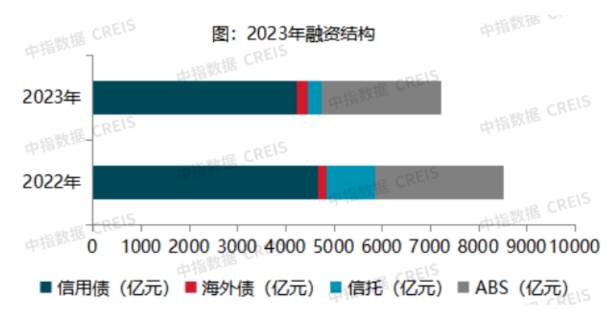 值得注意的是,虽然近一年来监管层密集发布政策鼓励融资,但民营房企的融资环境仍未有明显恢复。据中指研究院发布的最新报告,2023年房地产行业融资规模延续下降态势,信用债、ABS为融资主力。