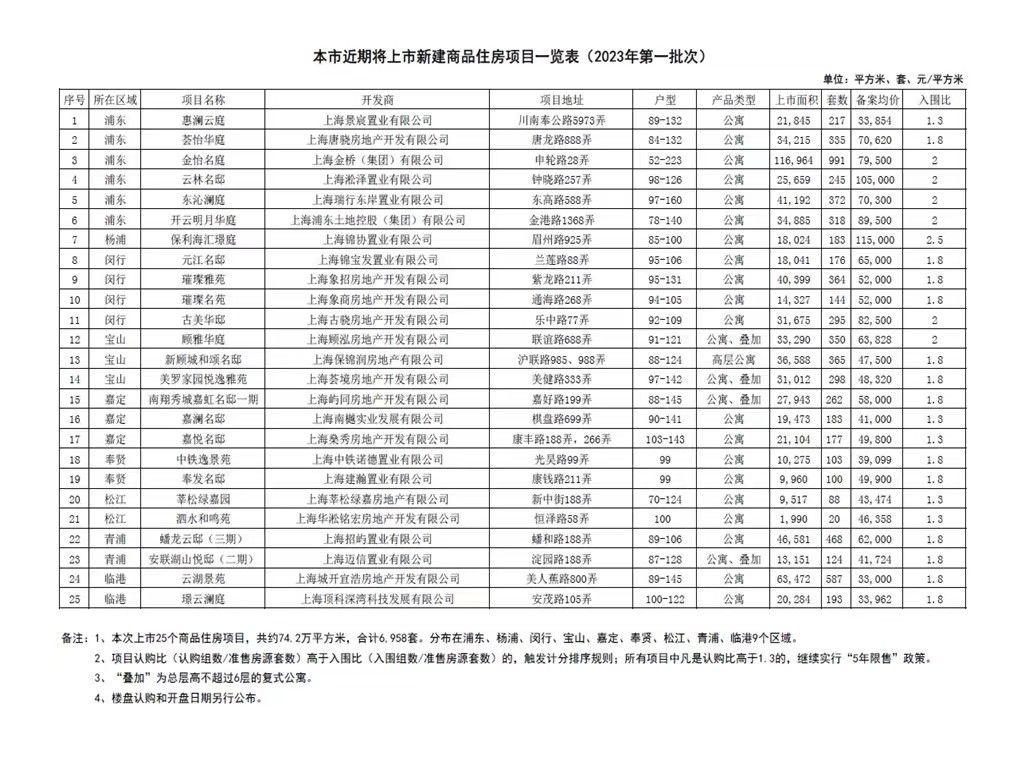 上海2023年第一批将上市新建商品住房一览表显示,位于杨浦的保利海汇璟庭入围比为2.5,浦东的金怡名邸、开云明月华庭及闵行的古美华庭等6个项目的入围比为2。