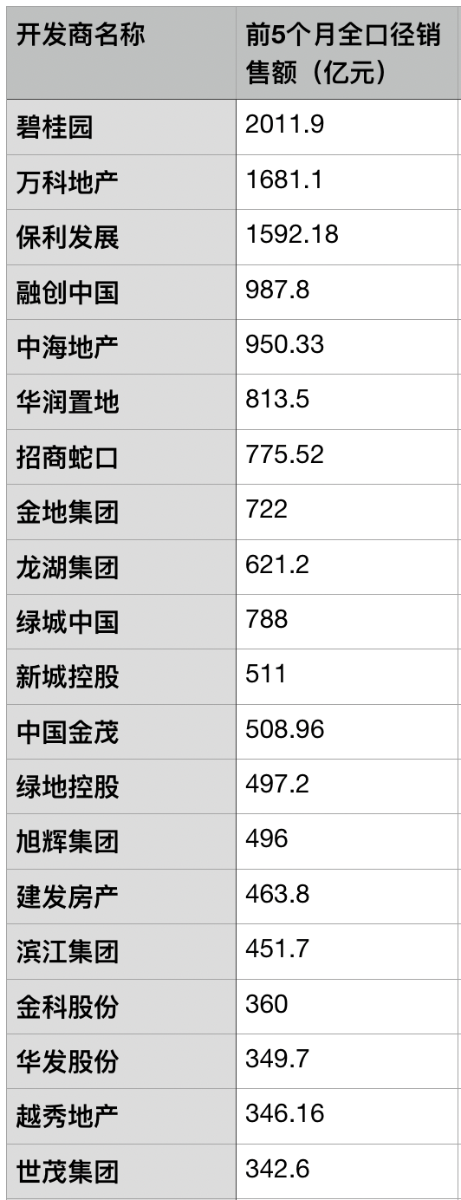 澎湃新闻在统计了TOP20房企的销售额后发现,房企在前5个月的销售额中均出现了同比下降的情况,而销售额过千亿的房企仅有三家,分别为碧桂园、万科企业股份有限公司和保利发展,全口径销售额分别为2011亿元、1681亿元和1592亿元。