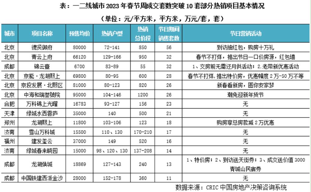 具体来看,一二线城市北京、成都等热销项目主要集中在供应稀缺、配套健全的核心片区,以改善项目居多,项目走量较佳。