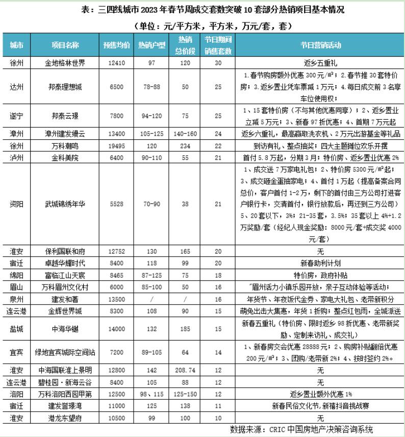我们通过调研35个城市春节期间热销项目可看出,96个热销项目中,有63个位于三四线城市,占比高达66%,核心一二线城市项目去化表现显著不及三四线城市。