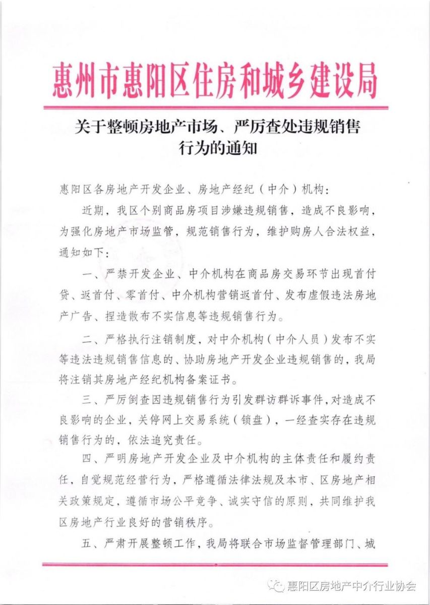 惠阳区住建局在《通知》中表示,近期,该区个别商品房项目涉嫌违规销售,造成不良影响,为强化房地产市场监管,规范销售行为,维护购房人合法权益,严禁开发企业、中介机构在商品房交易环节出现首付贷、返首付、零首付、中介机构营销返首付、发布虚假违法房地产广告、捏造散布不实信息等违规销售行为。