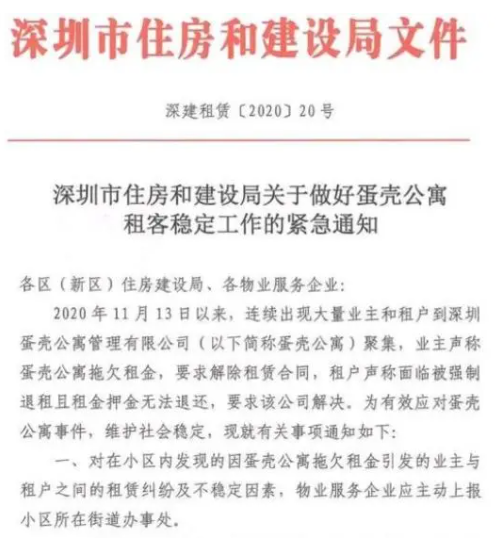 近日,深圳市住房和建设局发布《关于做好蛋壳公寓租客稳定工作的紧急通知》,要求物业不得通过停水电等方式驱赶相关蛋壳租户。
