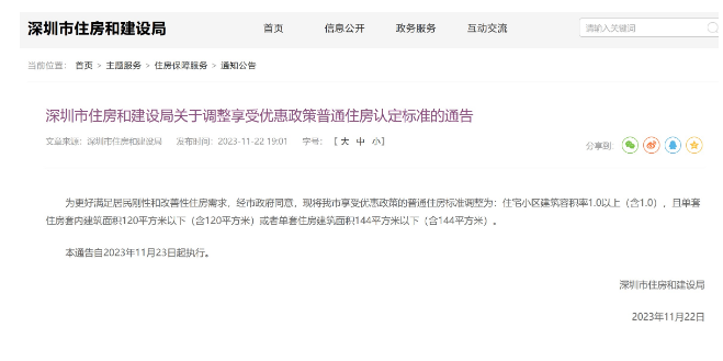 具体来看,11月22日晚间,深圳市住房和建设局发布关于调整享受优惠政策普通住房认定标准的通告(以下简称《通告》)。