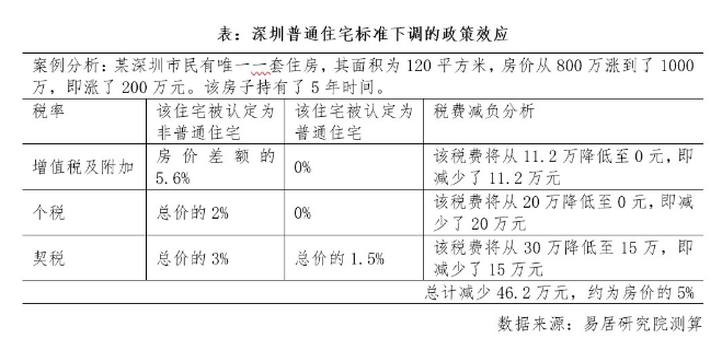 同时,根据易居研究院测算,随着深圳普通住宅认定标准的下调,一套120平的房子,税费总计可以减少46.2万元,减少额约为总价5%的比例。