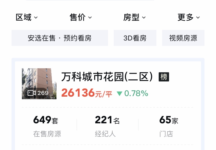 以二手住宅万科城市花园为例,其3月成交参考单价约22900元/㎡,安居客平台显示其当下一区挂牌参考均价约为22830元/㎡,一区挂牌参考均价约为26136元/㎡。同区域内同业态的精装新房售价基本已突破3万+每平。