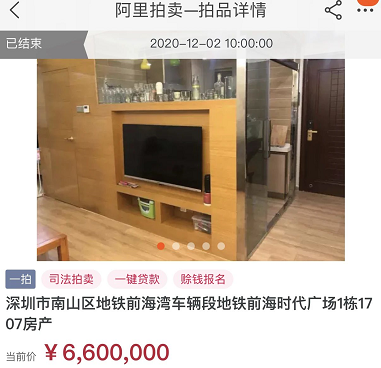 近日,位于前海湾的前海时代广场1栋1707的房产在淘宝上进行拍卖,该房产建筑面积为49.36平方米,起拍价660万。最终以起拍价成交,均价13.37万/平。