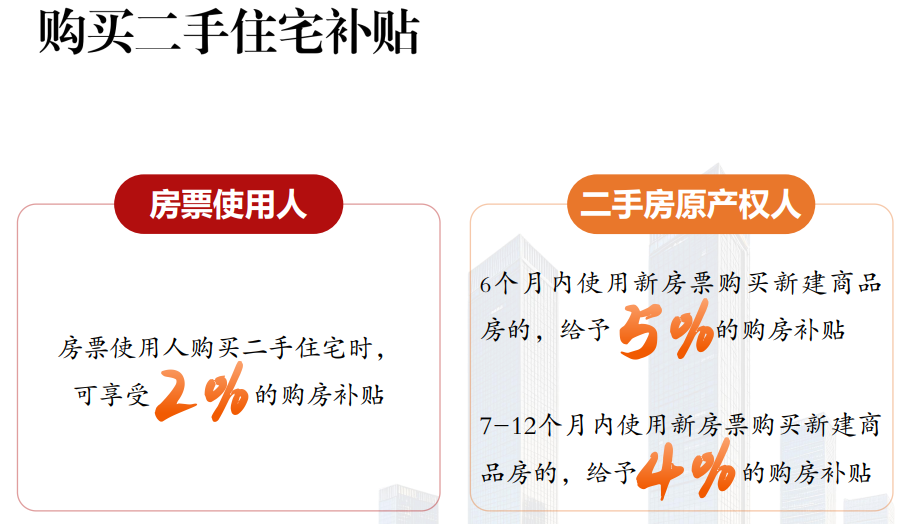 购买二手住宅的房票使用人亦可享受2%的购房补贴,而二手房原产权人在规定期限内使用新房票购买新建商品房,最高可享5%的补贴。