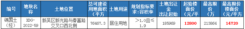 位于新吴区新光路与春富路交叉口西北侧,占地面积76467.3㎡,规划为居住用地,起拍总价185969万元,折合楼面单价12800元/㎡,最高限价213864万元,最高限价楼面价14720元/㎡。