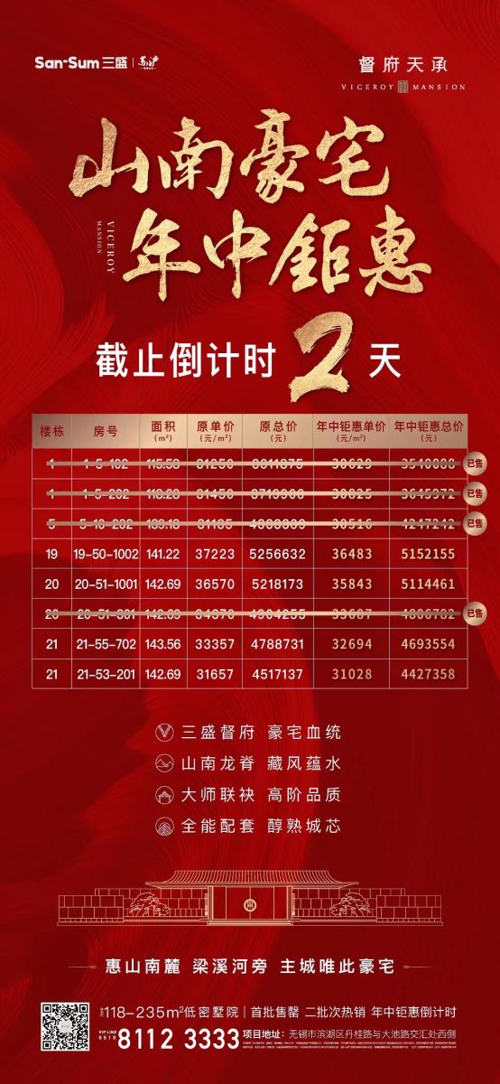 滨湖区另一高端盘三盛督府天承,年中也拿出了8套特惠房,目前已去化4套。相比于其他楼盘的优惠需要售楼处详询,三盛督府天承直接将特惠房源的价格情况对外释放。