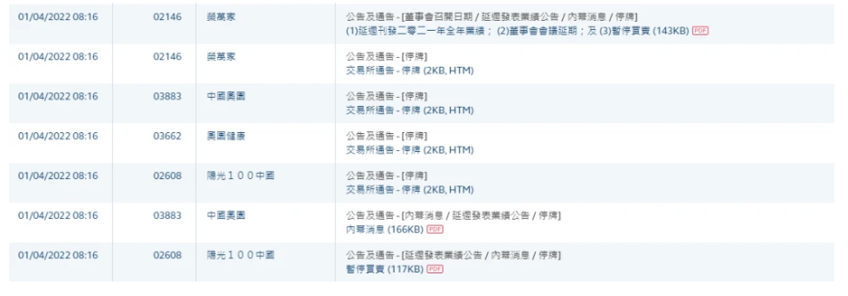 同日停牌的还包括:世茂集团(00813.HK)、佳兆业集团(01638.HK)、阳光100中国(02608.HK)、中国奥园(03883.HK)等。与此同时,彩生活(01778.HK)、荣万家(02146.HK)、奥园健康(03662.HK)等多家物企也公告暂停买卖。加上此前就停牌的中国恒大(03333.HK)、新力控股(02103.HK)、恒大物业(06666.HK)等,停牌的房企和物企合计数量超过13家。