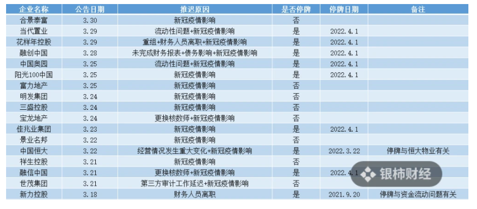 30日晚间,合景泰富也公告称,因新冠疫情影响,推迟刊发经审核的业绩报告。此前银柿财经曾统计,包括上述房企在内,还有富力地产(02777.HK)、祥生控股(02599.HK)等共15家房企预告推迟发布2021年年报(详情请见银柿财经报道《“成绩单”交不出,多家房企预告停牌》)。