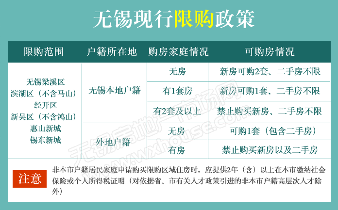 无锡目前的限购政策为在限购区域暂停向已拥有2套及以上住房的本市户籍居民家庭出售新建商品住房,不限购区域和二手住房没要求。