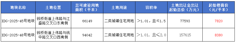 地块位于钱桥街道上伟路与钱中路交叉口西南侧,为居住用地,占地面积94042㎡,容积率>1.01且≤2.0,起拍总价157615万元,折合楼面价8380元/㎡。