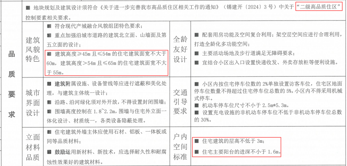 4、地块按照“二级高品质住区”打造,建筑高度≥45m且≤54m的住宅建筑面宽不大于60m,建筑高度>54m且≤65m的住宅建筑面宽不大于55m。