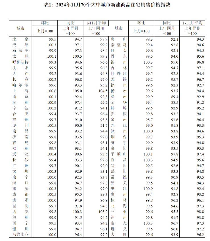 12月16日,国家统计局公布《2024年11月份70个大中城市商品住宅销售价格变动情况 》和《2024年1—11月份全国房地产市场基本情况》。