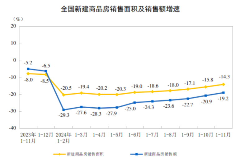“今年前11月,全国新建商品房销售额、销售面积累计同比降幅延续收窄态势,其中销售面积累计同比降幅已连续6个月收窄,销售额降幅连续7个月收窄,居民置业信心持续修复。”