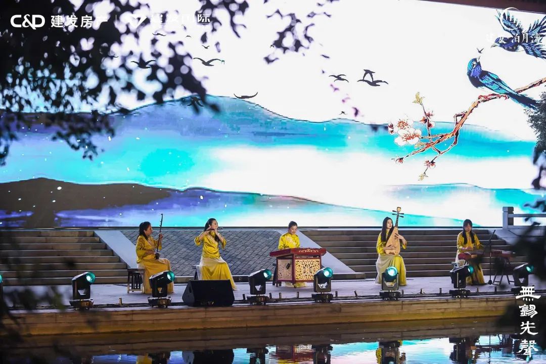 园林意境间,莲池映月,光影璀璨,折射出沉淀着历史文化的古韵空间,亭台楼阁,花木廊桥,飞檐屋脊,花窗框景,与民乐清音相呼应,营造出游园惊梦般的现场氛围。