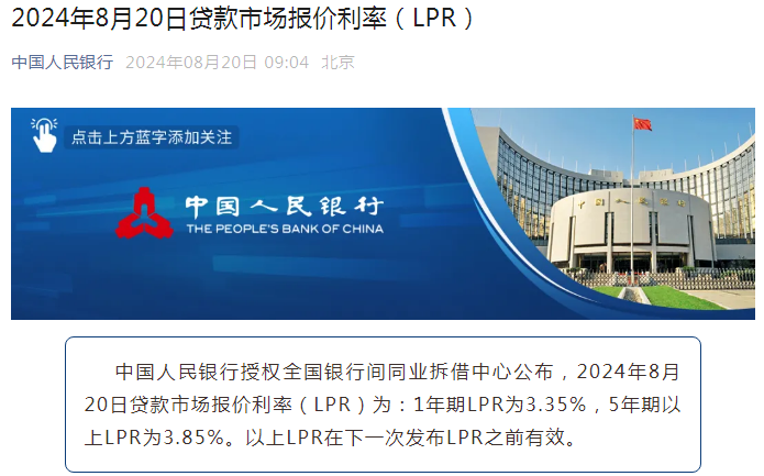 市场网首页 > 新闻中心 > 各地新闻 > 正文 8月LPR出炉,1年期、5年期均保持不变! 2024-08-20 09:24:43 中国人民银行 刚刚!央行公布最新LPR! 1年期LPR为3.35% 5年期以上LPR为3.85% 与7月的报价相比,没有变化! 中国人民银行授权全国银行间同业拆借中心公布,2024年8月20日贷款市场报价利率(LPR)为:1年期LPR为3.35%,5年期以上LPR为3.85%。以上LPR在下一次发布LPR之前有效。 (责任编辑:张一男)