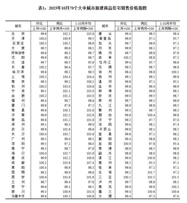 2023年10月70个大中城市新建商品住宅销售价格指数。 截图自国家统计局官网