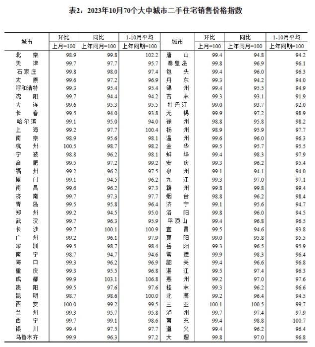 2023年10月70个大中城市二手住宅销售价格指数。 截图自国家统计局官网