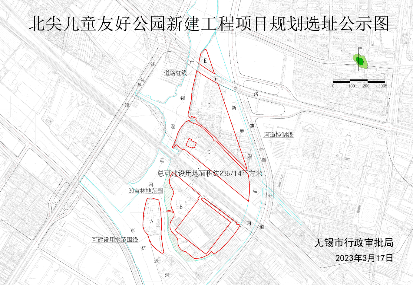 项目位于梁溪区老锡澄运河以东,用地范围四至:东至新锡澄运河、南至京杭运河、西至锡澄运河、北至用地边界,总可建设用地面积约236714平方米。用地性质为绿地。建设单位为无锡市北盛投资发展有限公司。