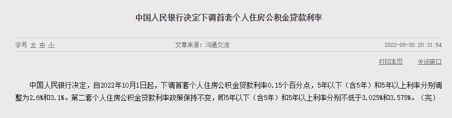 中国人民银行决定,自2022年10月1日起,下调首套个人住房公积金贷款利率0.15个百分点,5年以下(含5年)和5年以上利率分别调整为2.6%和3.1%。
