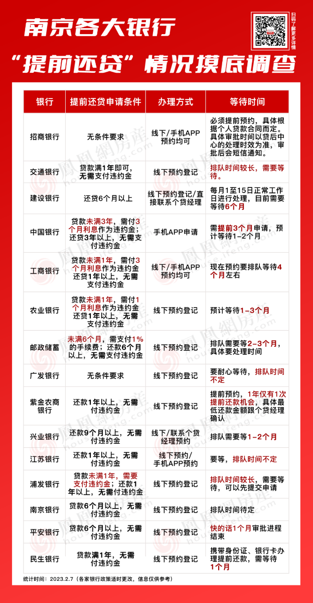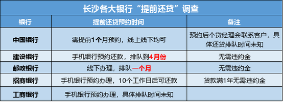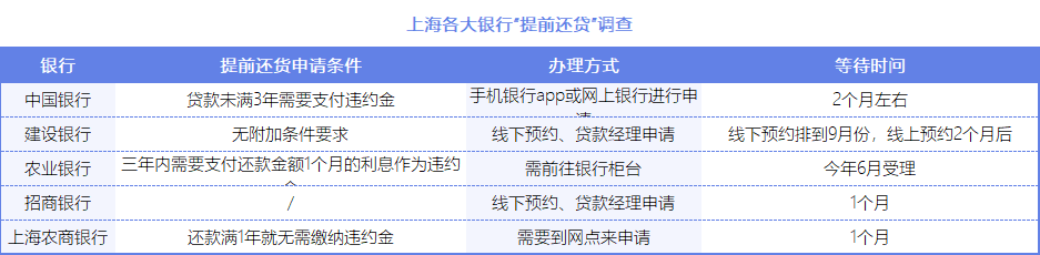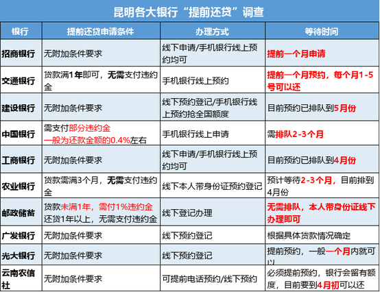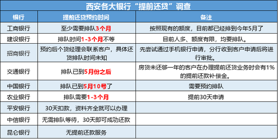 各大银行提前还贷目前需要排队等待1~6个月时间,部分还需支付违约金。