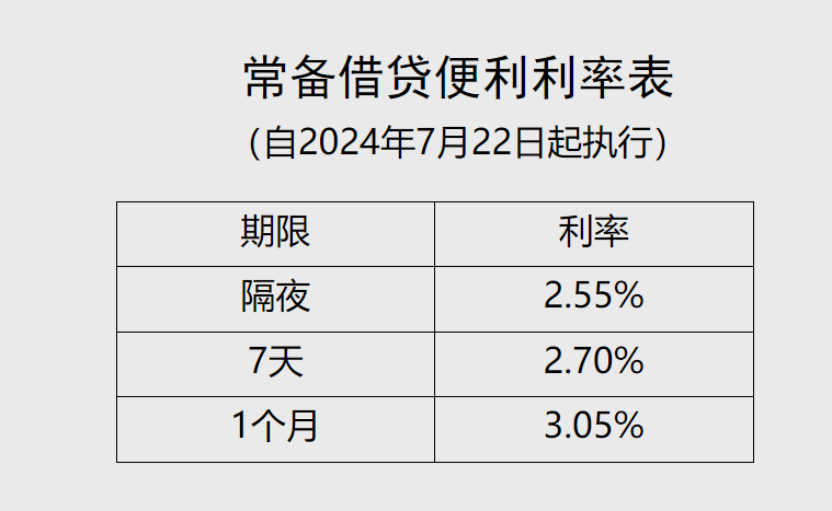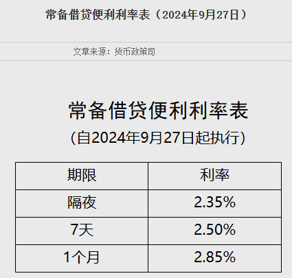 市场网首页 > 新闻中心 > 各地新闻 > 正文 央行:下调常备借贷便利利率20个基点 2024-09-27 14:35:00 央行 中国央行发布公告,将隔夜、7天、1个月常备借贷便利利率分别调整为2.35%、2.50%、2.85%。 根据央行7月22日发布的常备借贷便利利率表,隔夜、7天、1个月常备借贷便利利率分别调整为2.55%、2.70%、3.05%。 (责任编辑:张一男)