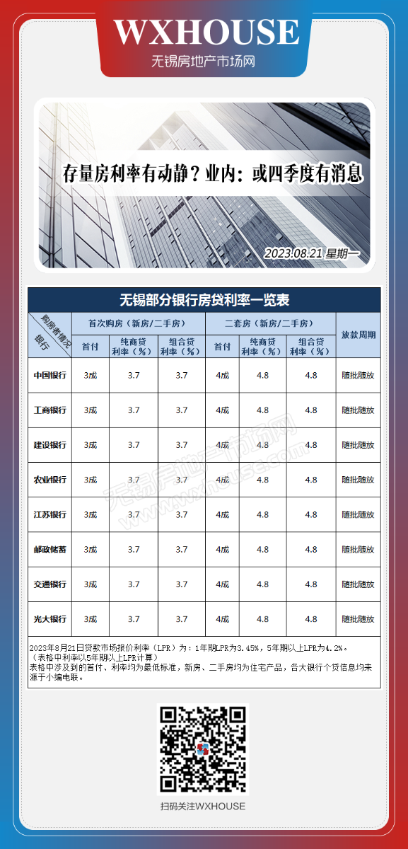 对此,小编致电无锡各大主流银行了解到:大部分个人住房贷款都是5年以上的,因此本期LPR的非同步调整并没有太大影响,当下无锡仍按照首套房个贷利率最低3.7%执行,二套房个贷利率最低4.8%执行!