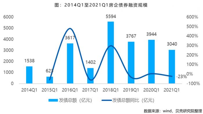 根据贝壳研究院统计,2021年一季度房企境内外债券融资累计约3040亿元,同比下降23%,为2018年以来首季度的最低发行规模。其中境外债发债规模大幅下滑,较去年同期下降43.5%。