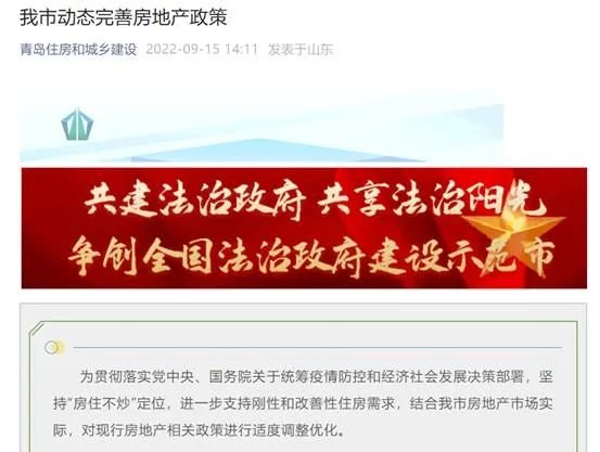 9月15日,“青岛住房和城乡建设”公众号发布了青岛将动态完善房地产政策的内容。