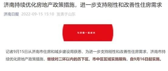 其中提出,为进一步支持刚性和改善性住房需求,济南市持续优化房地产政策措施,继续对二环以内的历下区、市中区区域实施限购,自9月16日起实施。
