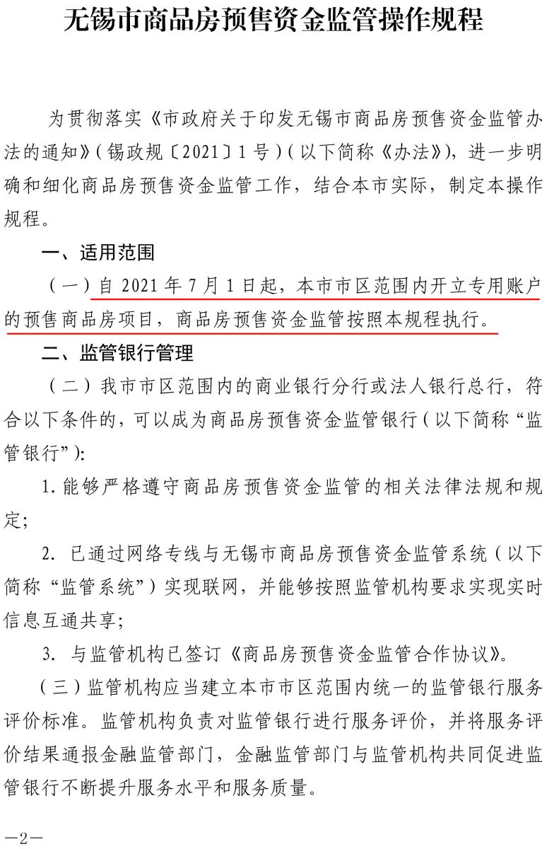 《无锡市商品房预售资金监管办法》将于2021年7月1日起施行。