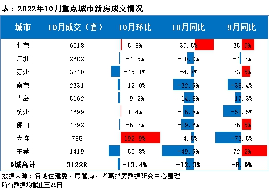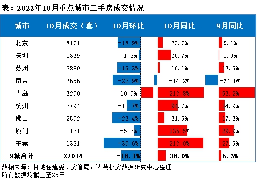 从二手房市场看,根据诸葛找房数据研究中心监测数据显示,监测重点9城(北京、深圳、苏州、南京、青岛、杭州、佛山、厦门、东莞)10月二手房成交27014套,环比下降16.1%,同比上涨38%,较9月同比扩大31.7个百分点。