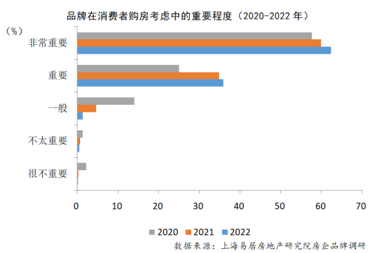 品牌在消费者购房行为中起着重大的影响。报告显示,2022年,在消费者对房企品牌重视程度方面,选择非常重要的达62.34%,较2021年上升2.51个百分点。选择重要的占比35.89%,较2021年上升1.11个百分点。选择一般的占比1.24%,不太重要的占比0.42%,很不重要的占比为0.11%,这几项均小于2021年的占比。总体看来,房企品牌成为消费者购房行为中越来越重要的考量因素。