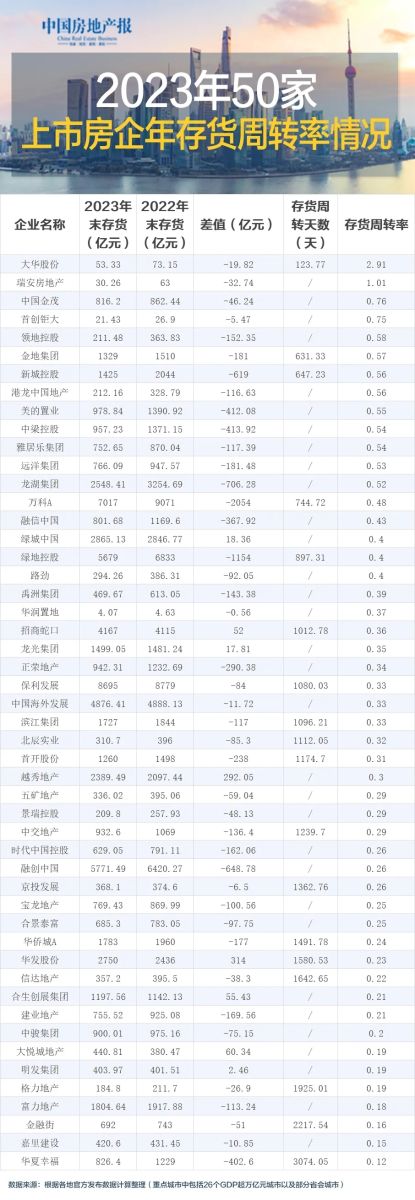 根据中国房地产报记者统计的数据显示,2023年50家上市房企平均存货周转率为0.417次/年,较2021年末存货周转率平均上升了0.01次/年。
